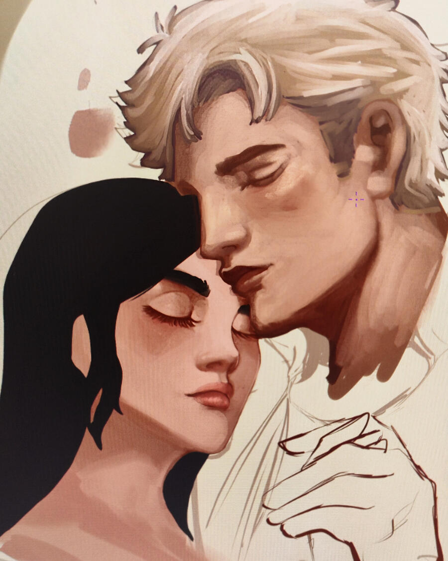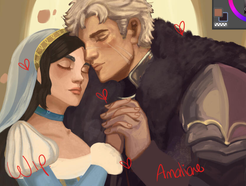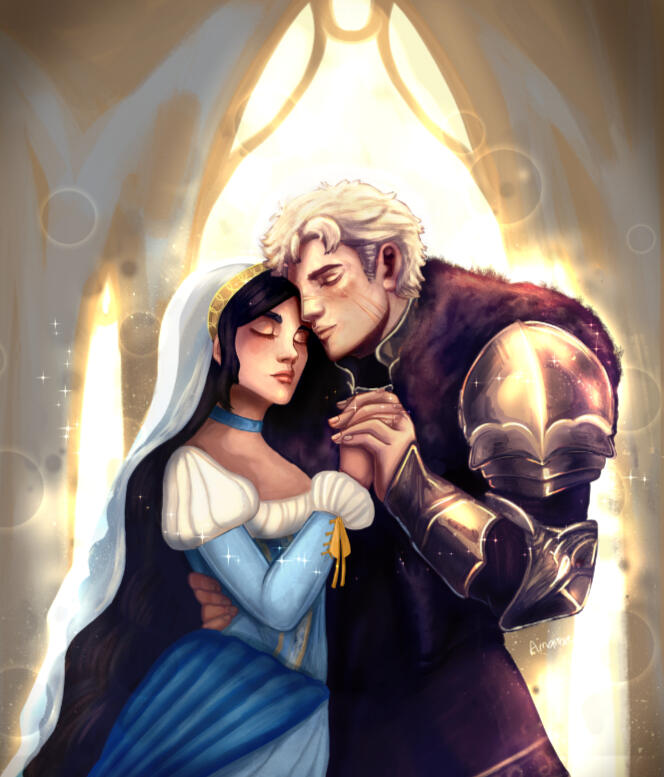 The woman is an OC belonging to a user, and the man is a canonical character. I drew inspiration from romantic novels and shoujo manga, and the piece also incorporates elements of medieval fantasy (which I’m not very familiar with in this fandom, to be honest). The theme revolves around the longing for a shared dream, as well as the songs included as inspiration by the requester.
